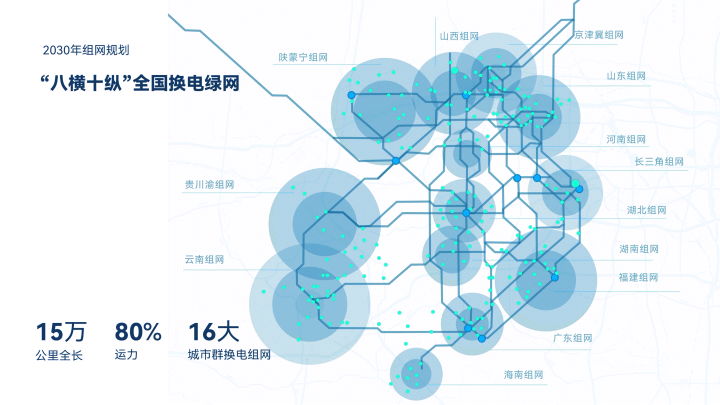 当前骐骥换电正针对干线物流、港口运输、大宗商品、多式联运等不同运输场景的物流特性推广应用。2030年将建设全长15万公里“八横十纵”换电绿网,组成16大城市群换电网,覆盖80%的干线运力。